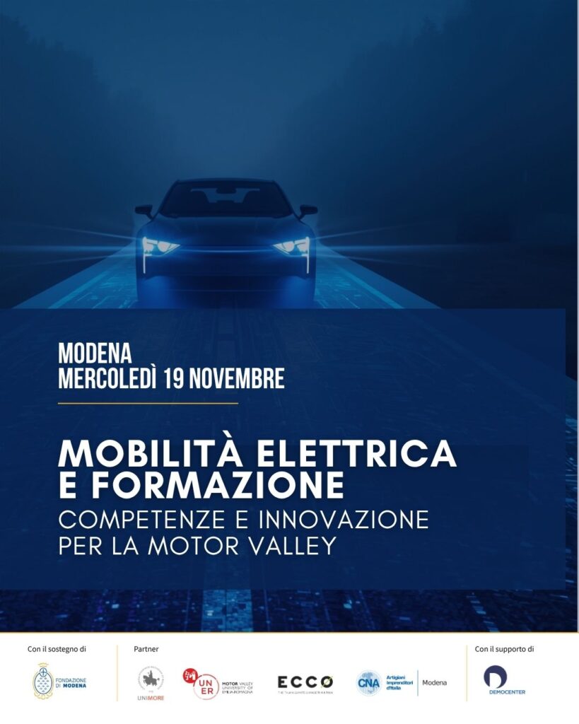 L’evento chiude le attività del progetto “Mobilità elettrica, occupazione e formazione: prospettive per la transizione nella Motor Valley” sostenuto e finanziato da Fondazione di Modena, in partenariato con Università di Modena e Reggio Emilia, MUNER Motor Valley University of Emilia Romagna, Think Tank ECCO, CNA Modena e con il supporto di Fondazione Democenter.
